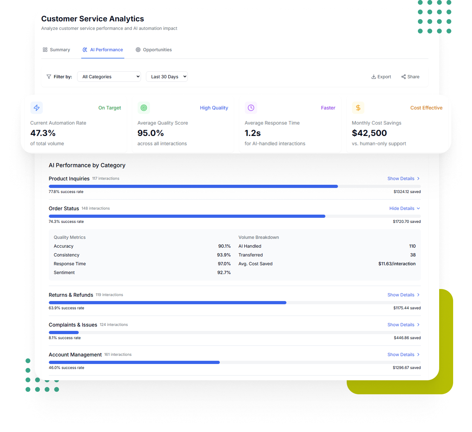 Most tools treat AI and human agents as separate worlds. Spearfish unifies measurement across your entire operation—resolution rates, sentiment, and outcome metrics in a single dashboard. Understand what’s working, what isn’t, and where the right balance is for your customers.